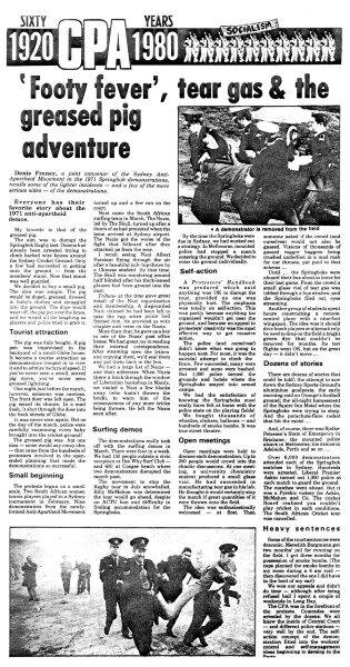 “…the all-white, racially selected, Springboks football team arrived. ….The old Australian passion for sport combined with the new-found hatred of racism to inspire massive demonstrations against apartheid whenever the team appeared… Brawls, broken heads and bad language were most plentiful in Queensland where the Country Party Premier, Mr. Bjelke-Petersen, declared a state of emergency and sent large numbers of aggressive policemen to the football matches.” (R. Ward, A Nation for a Continent, pp 396-7)